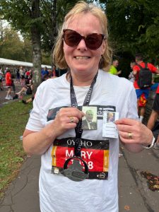 We are proud to share Mary’s picture, with her “Finishers” medal and photos of her parents which she carried with her on the day. We know they spurred her on during the run and that it was an emotional and special day for her. We are grateful to have been a part of it.